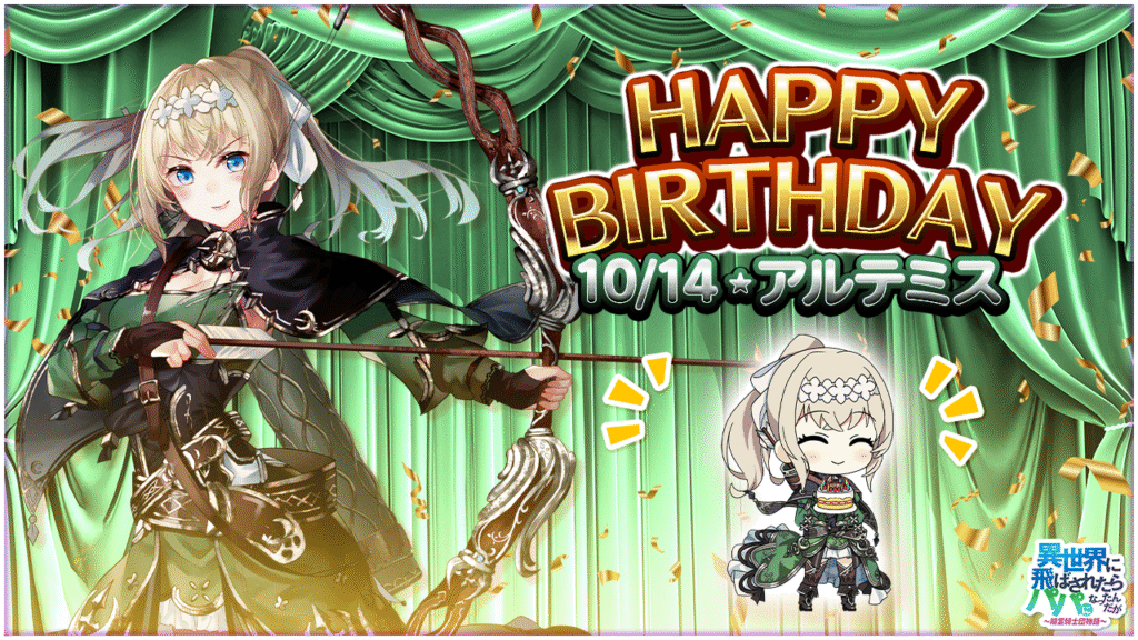 10月14日はアルテミスの誕生日!記念クーポン発行! イベント Twitter Facebook はてブ Pocket LINE コピー 2025.10.14 Happy Birth Day~【アルテミス】 今日はアルテミスの誕生日♡ シカを一発で捕らえられるほどの狩りの腕前を持つアルテミス♡ アルテミスの誕生日を記念して、アイテムをプレゼント!ゲーム内のポストからお受け取りください♪ ★受取期間:10/16 23:59まで 公式X(旧Twitter)ではアルテミスのお祝いコメントをお待ちしております~! 今後とも『異世界のパパ』をよろしくお願いします。 アプリへ移動 今後とも『異世界のパパ』をよろしくお願いします。