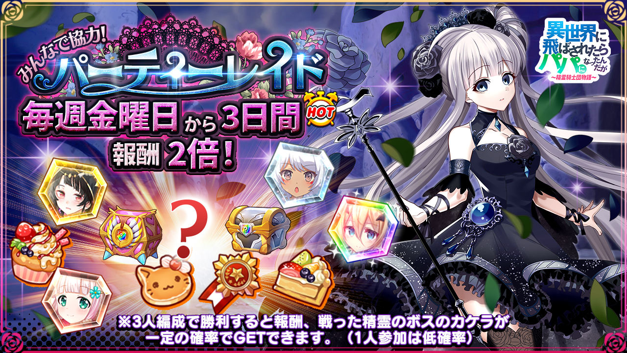 毎週金曜日から3日間、パーティレイドドロップ率2倍を開催いたします。