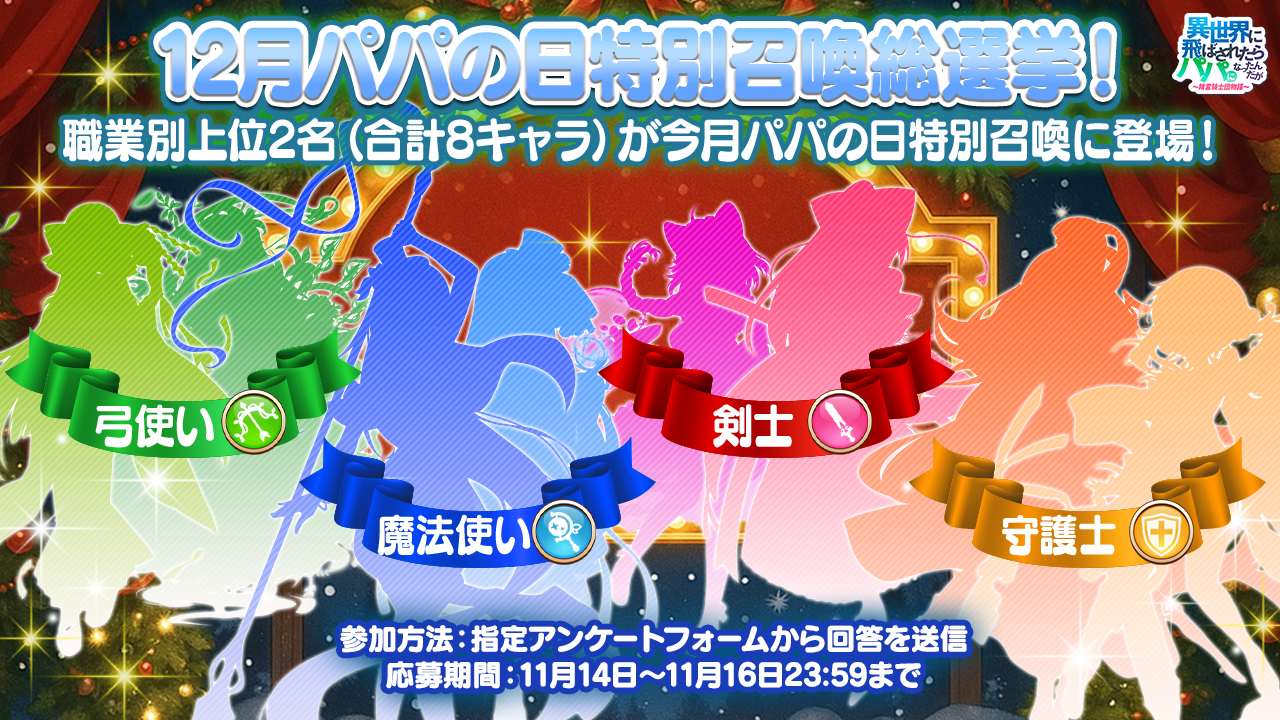 来月12月のパパの日特別召喚(毎月8日)に登場するキャラクターを投票で決定!